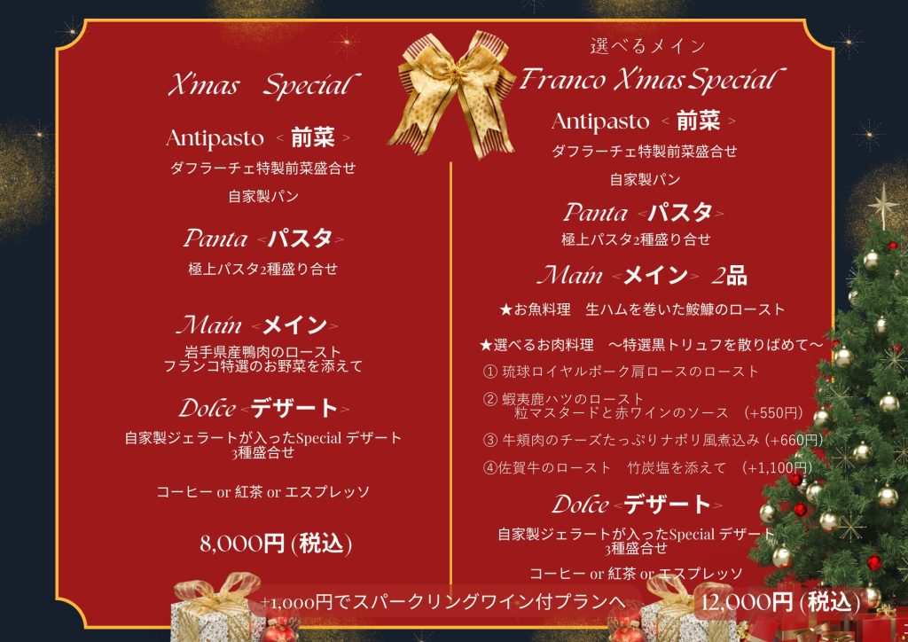◎Xmas限定!佐賀牛や牛頬肉を選べるその日限りフランコのスペシャルディナーコース 12,000円 (税込)